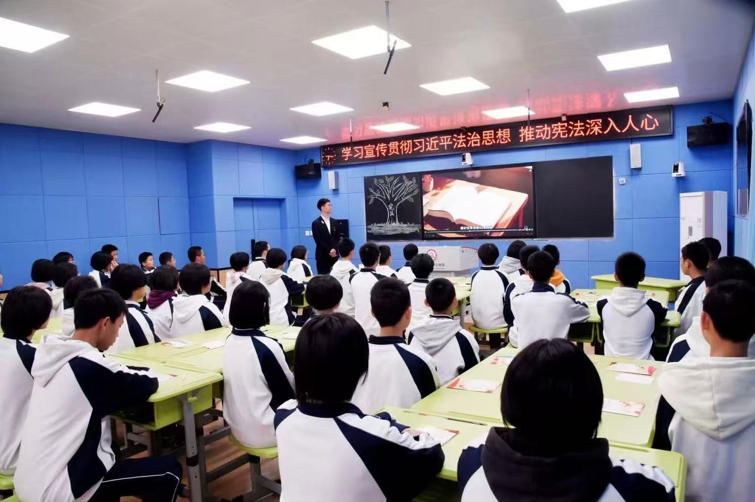 宪法晨读结束后,学校道德与法治课教师雷亮生面向全校讲授了一堂“走近宪法、学习宪法、践行宪法”主题班会公开课,全体师生通过校园录播系统观摩了雷老师的精彩授课。