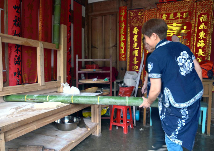 竹跳面制作技艺:竹跳面,传承古法手工技艺,采用天然草本植物毛竹灰泡制,反复过滤提取的碱水,将提取的碱水与面粉相融合,用手揉面成团。竹跳面另一特点就是用竹竿将和好的面团经过反复的跳动、挤压、打粉等多道工序。制作后形成的柔软的面团做成的面条。