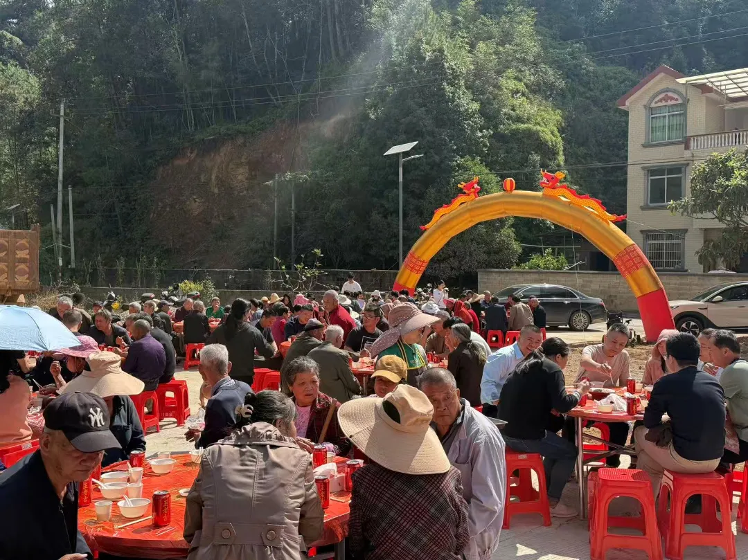 义剪活动结束后,两村的老人齐聚一堂围坐在摆满菜肴的圆桌旁共同吃“重阳宴”,整个宴席间满是温馨融洽的氛围。