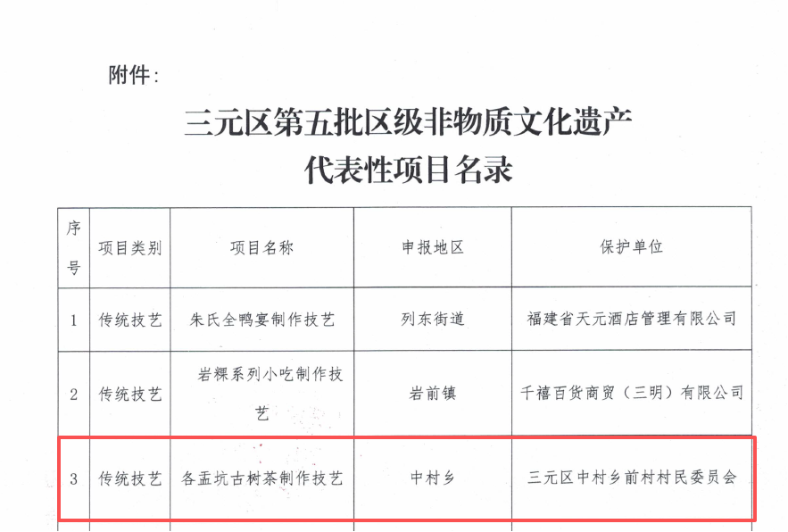 近日,三元区人民政府正式公布第五批区级非物质文化遗产代表性项目名录,各盂坑古树茶制作技艺成功入选。这一承载百年匠心的传统技艺,正式成为三元区非遗大家庭的重要成员,也为中村乡前村村乡村振兴再添一张特色金名片。