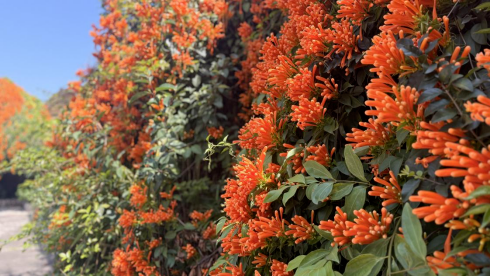 岩前春日最出圈的“颜值担当”,当属那片盛放的炮仗花墙啦!纤细藤蔓顺着老墙肆意攀援,将一整个冬天的蓄力,尽数化作满墙的橙红烂漫。一串串花穗垂落而下,挨挨挤挤、热热闹闹,恰如“早将爆竹挂寒郊”的诗意,无声却满是蓬勃的生机,一眼便撞进春日的温柔里。