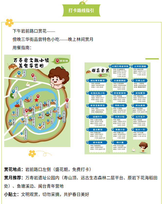 逛完热闹的花墙,不妨来尝尝当地的烟火气——在岩前的街头还有很多特色美食,如闽台青年餐馆、三华街酒楼、万寿山庄等,都是极具岩前特色的美味,此外,这里也是一个绝佳的赏月点。夕阳落幕、灯光亮起,和好友找一家街角的家常小店坐下,点上几样地道小菜,伴着月色,慢慢吃、细细聊。吃饱喝足后,沿着街巷慢慢走,这便是岩前春夜里最惬意的时光。