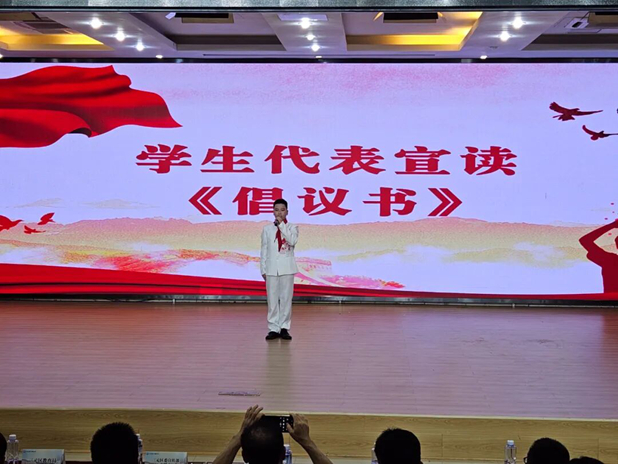少先队员代表迈着坚定的步伐走上发言台,宣读《倡议书》。他以真挚的情感,向全体同学发出倡议:我们要怀抱梦想,脚踏实地,成为一名有理想、有本领、有担当的“新时代好少年”。我们要为中华民族的未来奋发图强,为祖国的明天奋勇争先!爱护国旗,尊重国旗,践行“请党放心,强国有我”的铿锵誓言。