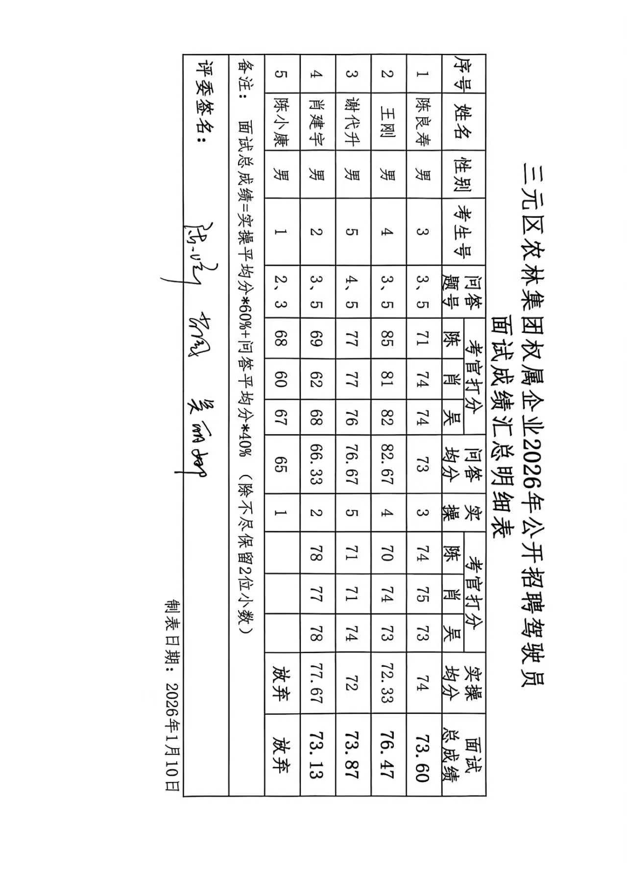 关于三元区农林集团权属企业2026年公开招聘驾驶员面试成绩的公示