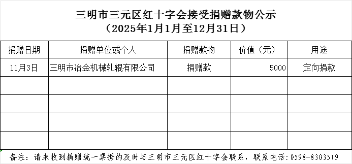 三明市三元区红十字会接受捐赠款物公示(2025年1月1日至12月31日)