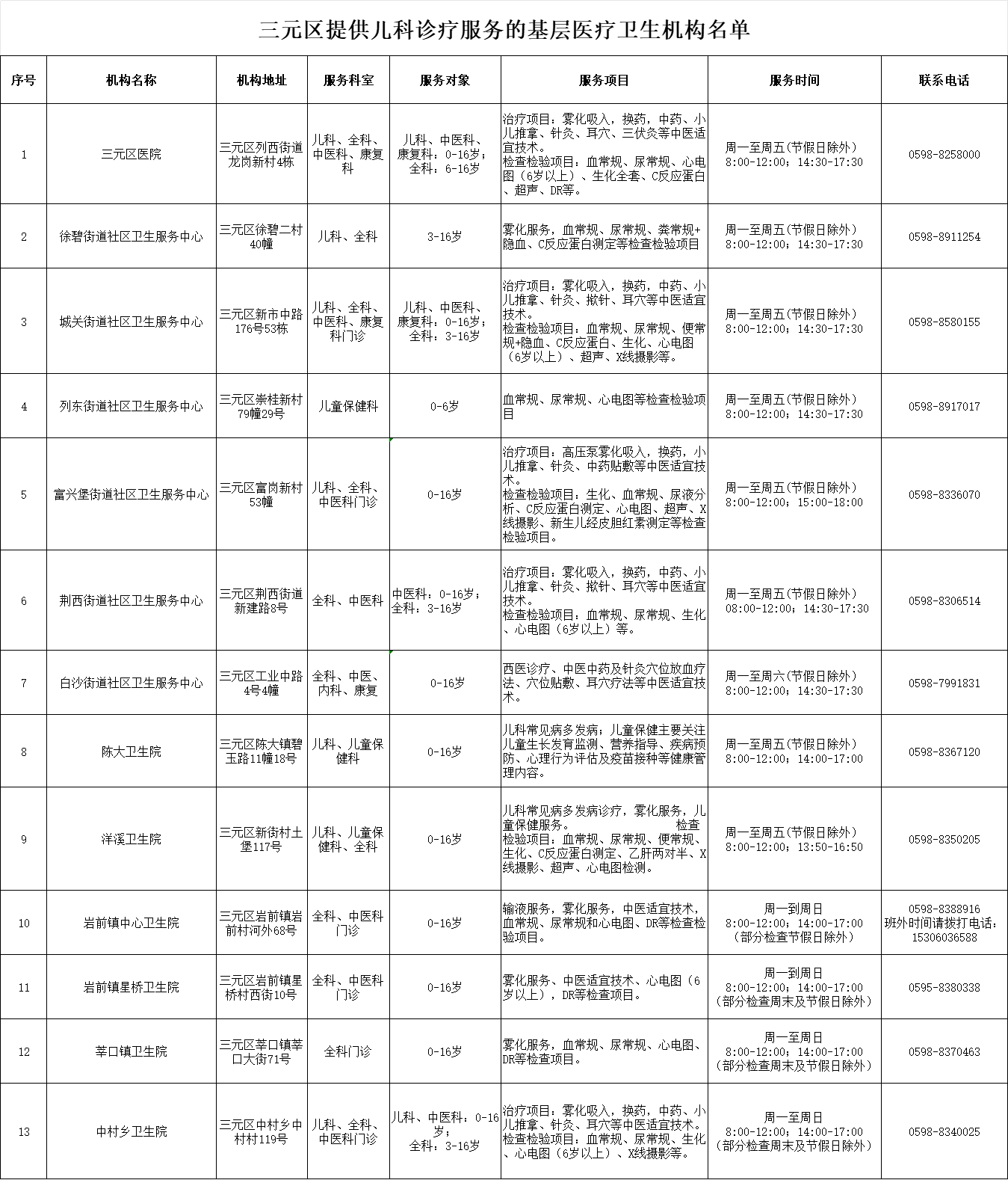 三元区公布提供儿科诊疗服务的基层医疗卫生机构名单